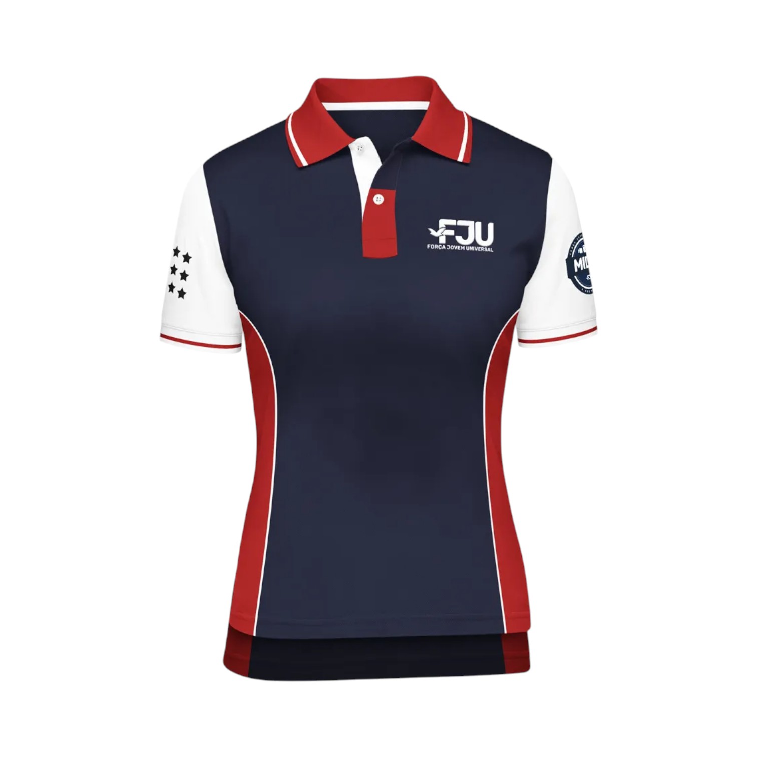 Uniforme oficial do projeto, a camisa polo FJU Mídia feminina foi desenvolvida em tecido piquet, possui toque macio e é bem confortável. Além da combinação das cores azul, vermelho e branco que já é a marca registrada da FJU, ela também possui mullet quadrado e a logo bordada na gola. O brasão feito em silk emborrachado na manga esquerda mostrará a todos que você faz parte do Mídia FJU! Os mídias são aqueles que difundem o trabalho realizado pela Força Jovem Universal para todo o mundo. Com muito talento e criatividade, eles registram e divulgam os melhores momentos das reuniões, ações e eventos da FJU nas mídias sociais, o que é essencial para que o grupo alcance outros jovens. O que significam as 9 estrelas feitas em silk na manga direita? Elas representam os 9 Frutos do Espírito Santo: Amor, Alegria, Bondade, Benignidade, Longanimidade, Paz, Mansidão, Fidelidade e Domínio Próprio.